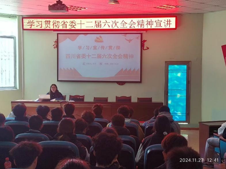 11月27日,体育与健康教育学院面向青年大学生宣讲四川省委十二届六次全会精神专题宣讲会。专职辅导员朱玉主讲,学生党员、预备党员、团员及入团积极分子代表参加演讲会。