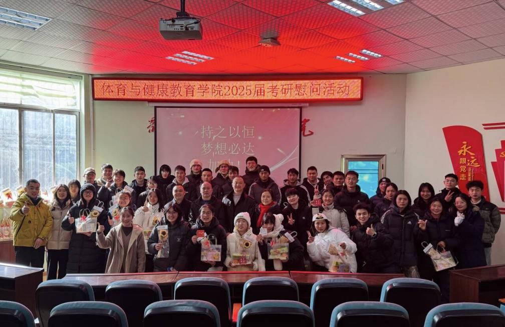 12月17日,体育与健康教育学院在多功能厅成功举办了一场以“冬日送温暖,研途笃信念”为主题的考研学子慰问活动。学院党委书记胥文勋、院长孙德朝、党委副书记张海龙、副院长赵利及学院全体辅导员出席活动,为2025届考研学子们送上关怀与期望。